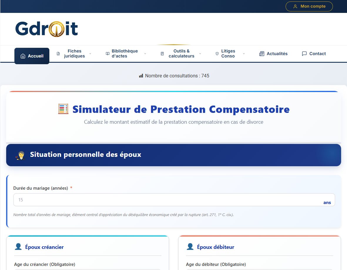 Ce simulateur a été conçu pour simplifier l’accès à l’information juridique. Il permet aux utilisateurs de saisir des données personnelles (durée du mariage, âge des époux, etc.) et d’obtenir une estimation chiffrée de la prestation compensatoire. L’objectif était de rendre un outil complexe accessible au grand public, tout en respectant les règles légales.